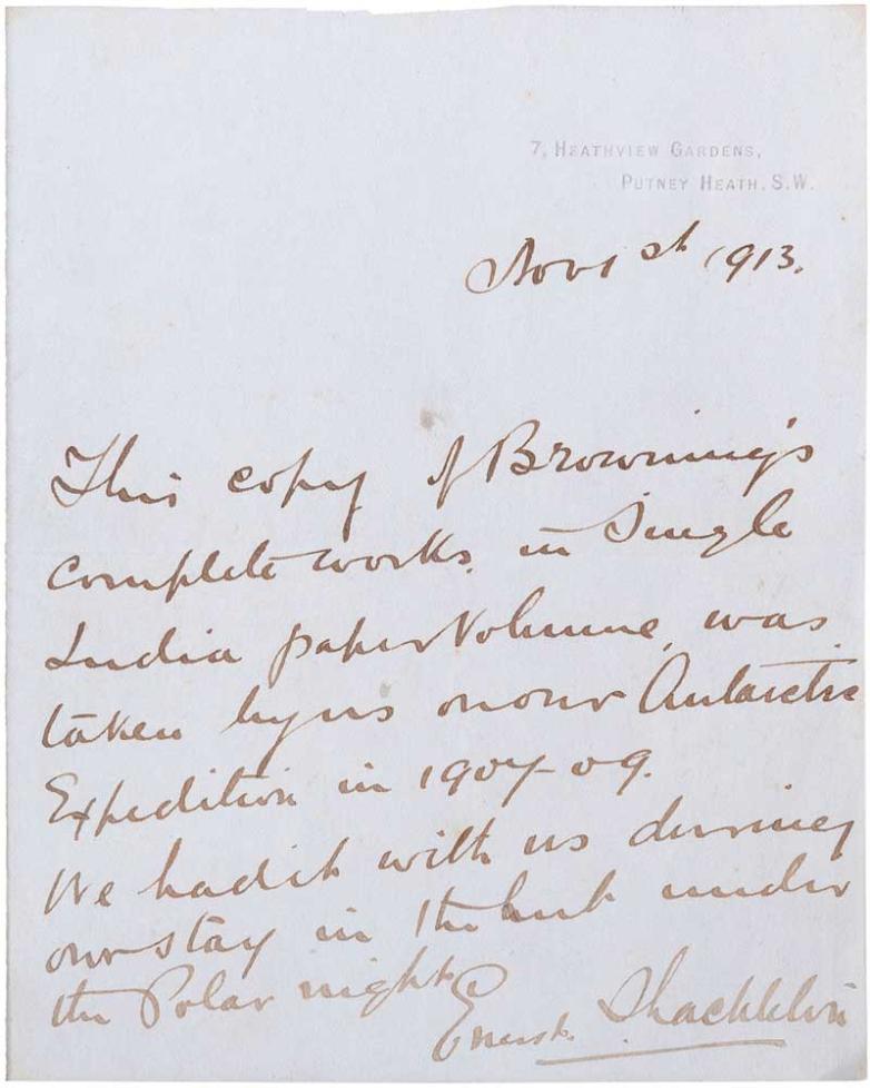 Shackleton would eventually be elected president of the Robert Browning Settlement. He presented the book in question to the settlement in 1913. It included a note by the explorer describing having this book on the expedition while “in the hut under the Polar night.”