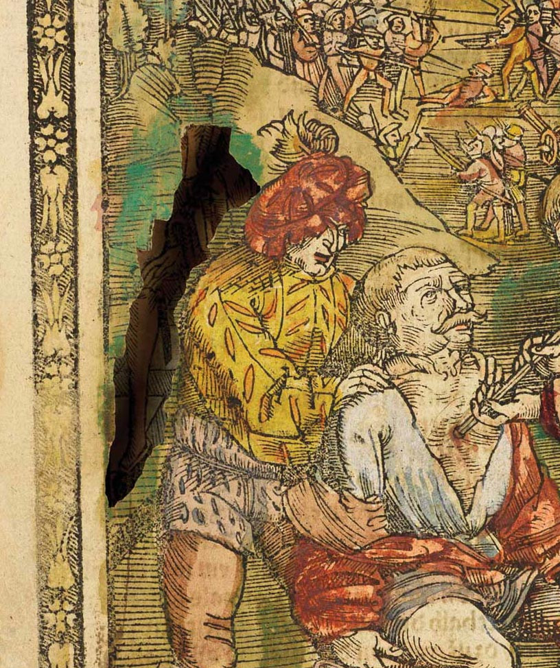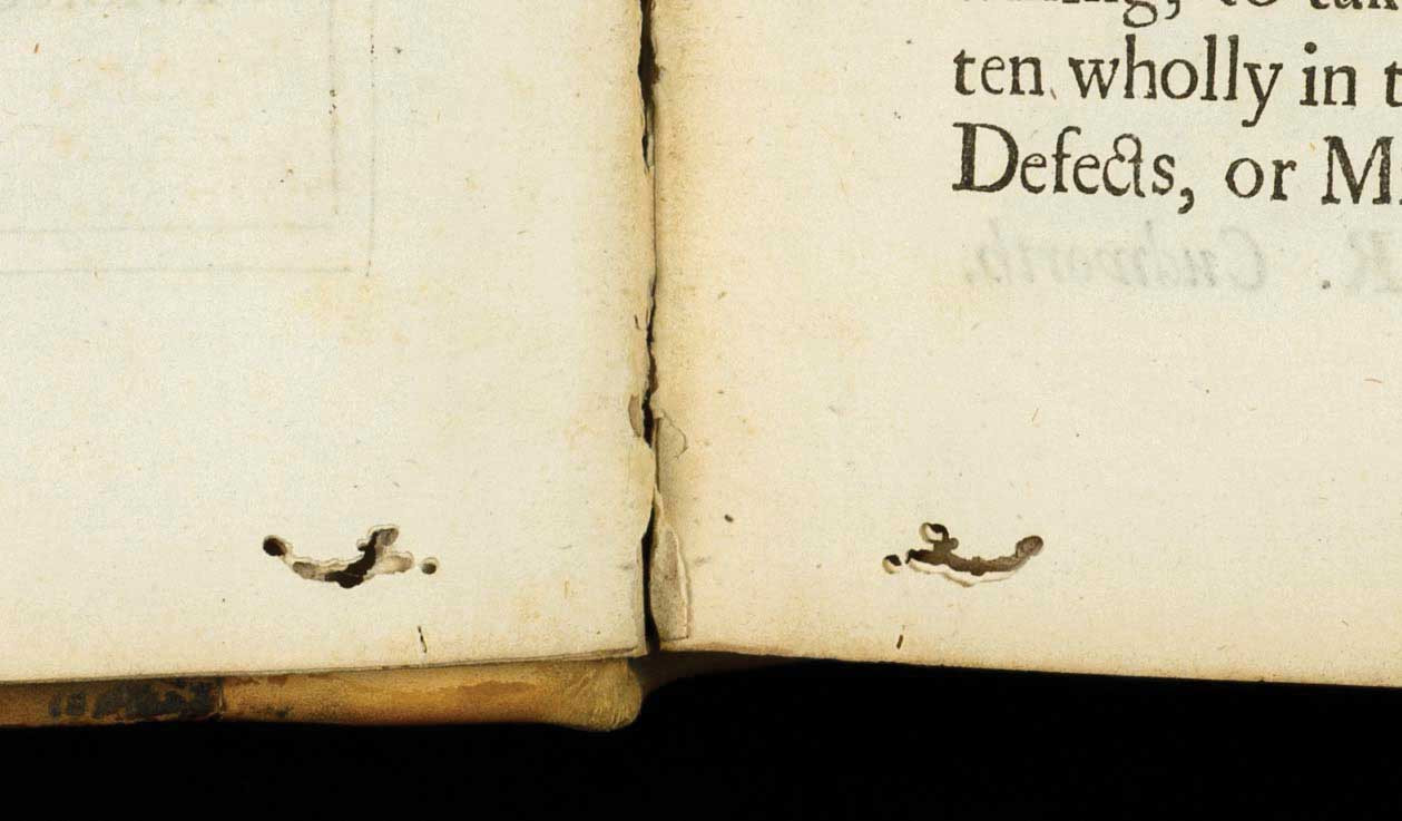 Printed books don’t have the same kinds of layout marks that manuscripts do, but the process of printing, especially during the period in which printing was done by hand, can also leave its traces in the form of holes. One of the more interesting pieces of evidence left by the operation of the handpress is the presence of “point holes.” These holes, which are often mistaken for the numerous holes that were made when the book was sewn for binding, occur in different places in books of various formats (e.g., folio, quarto, octavo, duodecimo). They’re hard to find, though, because they’ve usually been trimmed off or made invisible by the binding of the book. “Points” were the sharp metal projections used to pierce a sheet of paper and hold it in place on the tympan of a printing press, and the points needed to be placed carefully (and asymmetrically) to make it obvious to a pressman if a sheet were turned the wrong way around when it was put back on the press to print its other side. Point holes can be identified by their asymmetrical placement, and they’re most often visible in untrimmed books that are unbound, or which have been disbound. They tend to be much more visible in incunabula than in later books, and though they can be difficult to find, they’re interesting to look for, and they remain unknown to most collectors.