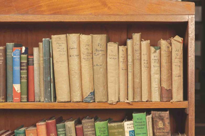 Part of the library at Springhill with books covered in brown paper for American troops housed there in the Second World War