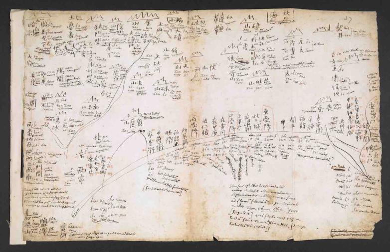 • A hand-drawn map of China by Shen Fuzong, the first recorded Chinese person to visit the UK in 1687