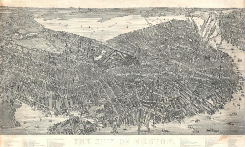 One of the most spectacular bird’s eye views of Boston ever published, this lithographic map of The City of Boston was published by O.H. Bailey & J. C. Hazen in 1879. With the built environment of the city rendered in meticulous detail. 28.625” x 44.125” plus margins.