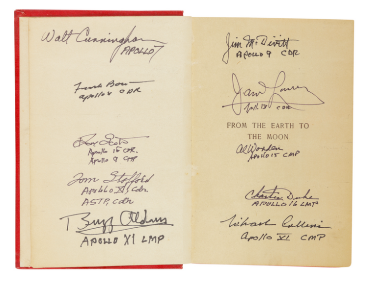 Headed to auction: Jules Verne’s From the Earth to Moon signed by ten Apollo astronauts.