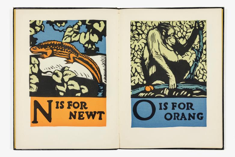 Each book in the exhibition illustrates a separate solution. C.B. Falls, in his 1923 ABC Book, chose the Newt to solve his N problem. “Noah,” as in Noah’s Ark ABC, is occasionally the solution. Some imaginative authors, such as Gus. Av. Friendly, have forsaken the zoological world altogether and created their own four-legged universe.