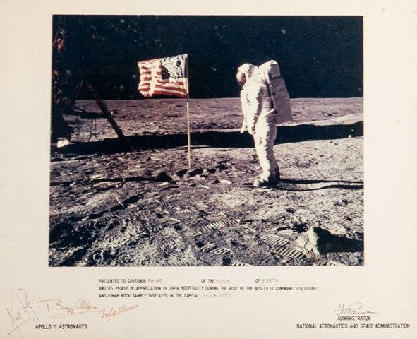 • Framed photograph “Man on the Moon” signed by Apollo 11 astronauts Neil Armstrong, Buzz Aldrin and Michael Collins ($2,000-3,000)