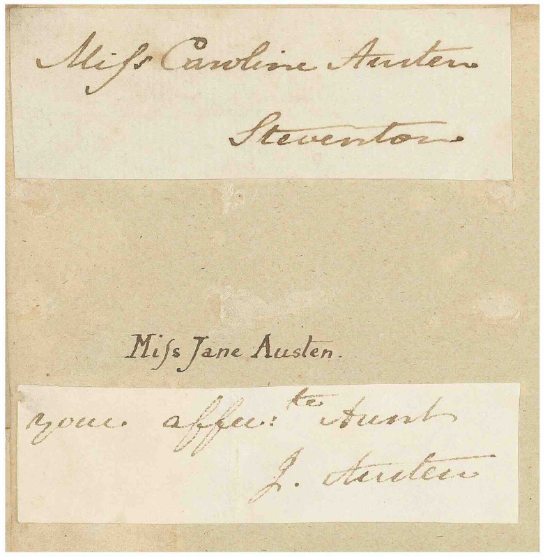 It contains two autograph fragments in the novelist's hand, a cut signature ("your affecte Aunt/ J. Austen") and a piece cut from an address panel addressed to her niece Caroline. Other entries in the album which was begun in 1833 were collected from the wider Austen family, including Edward Austen, Denis Le Marchant, James Edward Austen-Leigh, and Emma Austen.