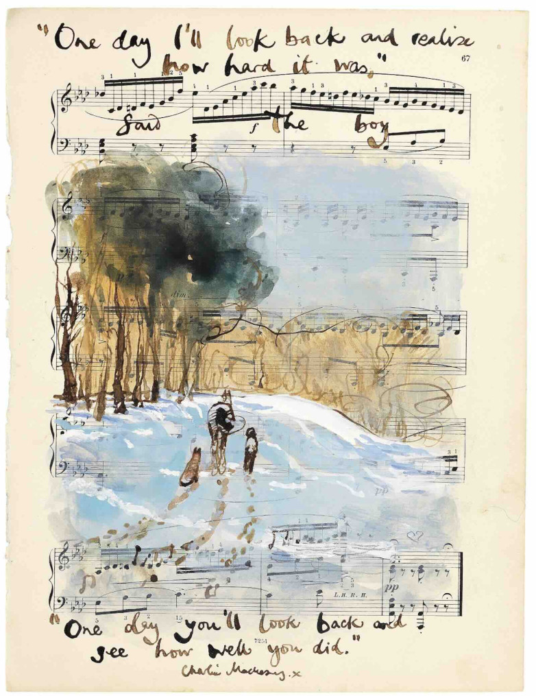 One day I'll look back, signed 'Charlie Mackesy' and inscribed "One day I'll look back and realise/how hard it was,"/said the boy/"One day you'll look back and/see how well you did." Gouache and ink on paper. Sold for £43,520 at Bonhams.