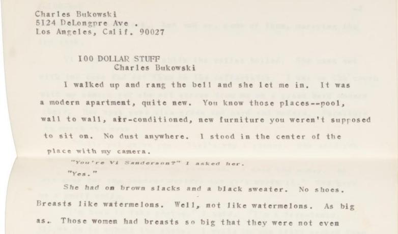 Original typescript of the unpublished story, “100 Dollar Stuff,” by Charles Bukowski. Sold for $6,250