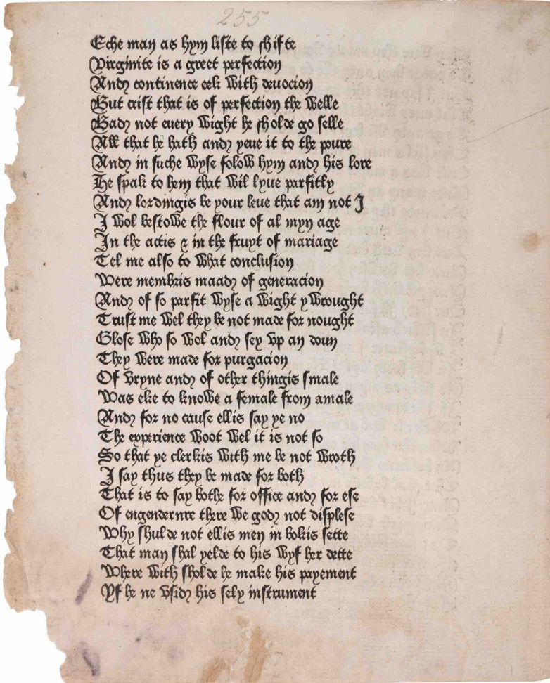 Going under the hammer with an estimate of $7,500 - $9,000, the single leaf comes from the first edition of William Caxton's 1476 printing of The Canterbury Tales by Geoffrey Chaucer. The passage begins with the line "Eche man as hym liste to shifte" and ends with "And bad our husbondis forto love us weel" (lines 104-161 of the Prologue). In this section the Wife of Bath discusses virginity and religion, arguing that women were allowed to use sex for both procreation and pleasure, and that a married woman has power over her husband.
