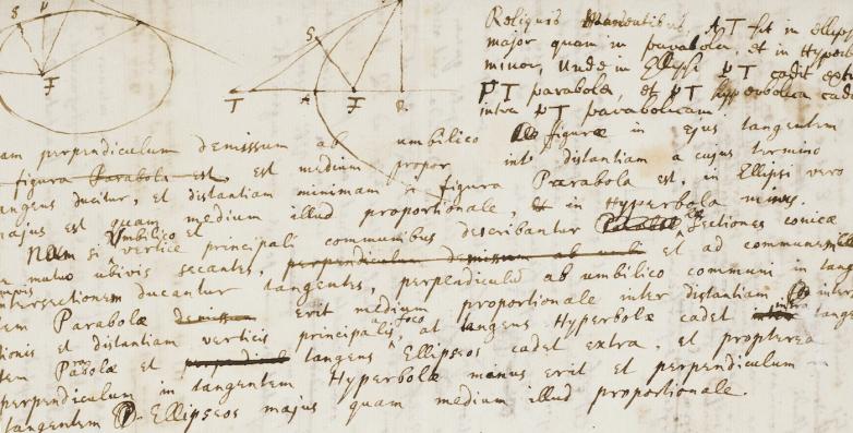 The autograph manuscript, handwritten in Latin on paper, comprises one and a half pages, with 39 lines in Newton’s hand, alongside 14 lines and two diagrams by the Scottish mathematician and astronomer David Gregory. The draft revisions relate to key sections from each of the three books of the Principia, on the compression of liquids, the orbits of comets and the motion of bodies in eccentric conic section.