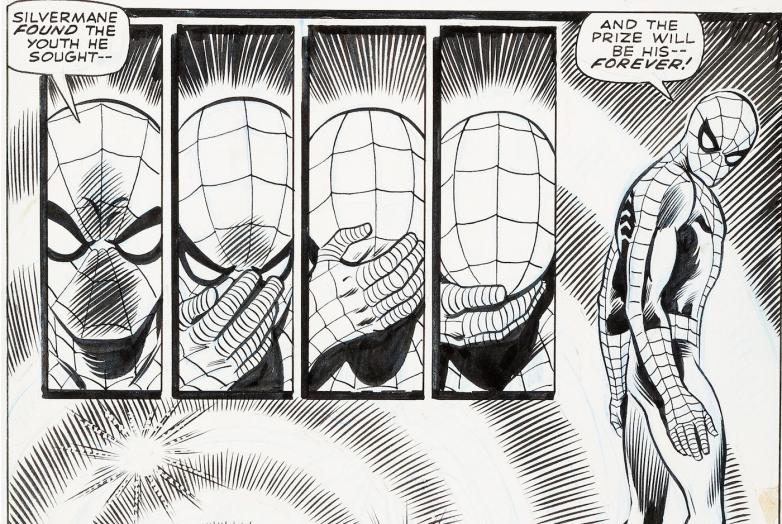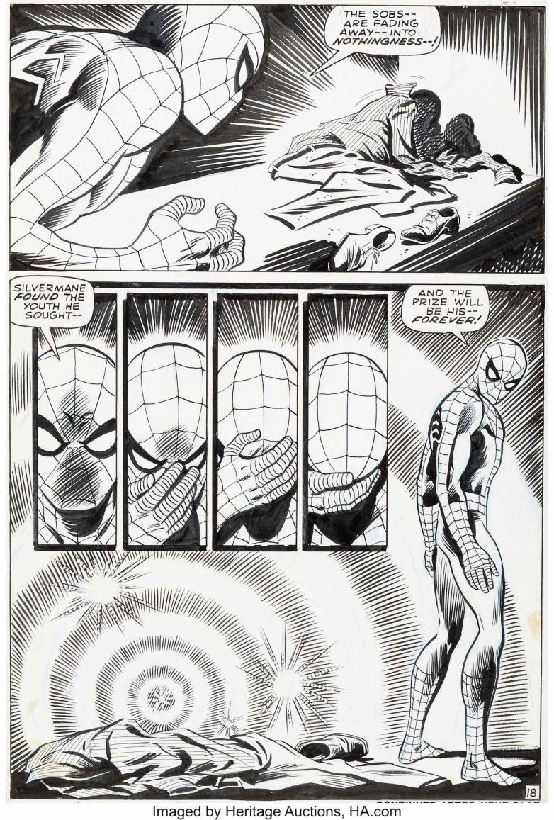 Among the offerings is Page 18 from 1969’s Amazing Spider-Man No. 75, in which Spider-Man watches the vanishing of the villain called Silvermane, who seems to de-age until he fades into “nothingness.” Romita and inker Jim Mooney feature the hero in every single panel as he anguishes over the heart-rending end of the gangster born as Silvio Manfredi. The page echoes the image on the cover of this classic issue.