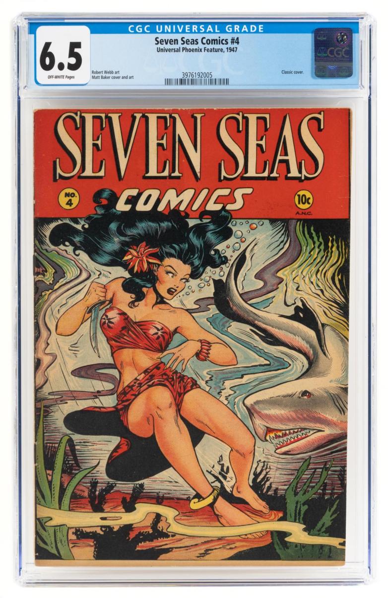 One of the lots that attracted the most interest was the Seven Seas Comics #4 with a CGC of 6.5. It has a classic cover, featuring Matt Baker's tropical beauty, Alani the "South Sea Girl," fighting a great white shark. This mag has gone white-hot with fans and investors in recent years. Speculator site Comicbookinvest.com picked Seven Seas #4 to share the number one slot in a 2019 list of the five hottest Matt Baker covers. The copy fetched $18,750 at PBA Galleries.