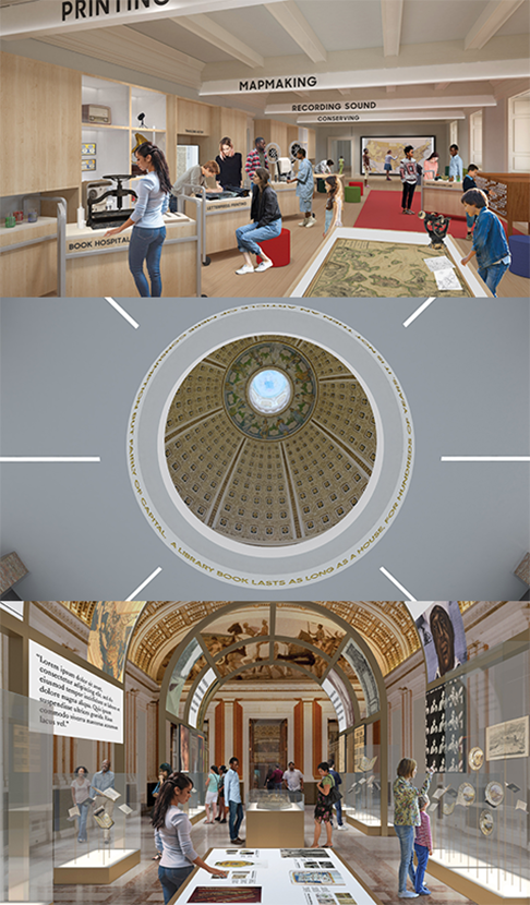 Artist renderings show concepts for three core components that are central to the visitor experience plan. They include a new learning lab, a ground level orientation center with a view of the Main Reading Room's dome and new exhibitions to feature the Library’s treasures.