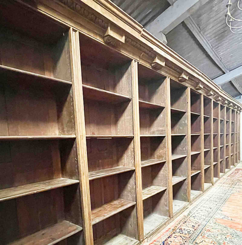 Measuring nearly 3m high and 12m long, the pine 12-bay wall-mounted bookcase with adjustable shelves was designed by Edward Blore around 1830, and then later reformatted c.1945. It is currently on sale at reclamation and salvage specialists LASSCO for £24,500.