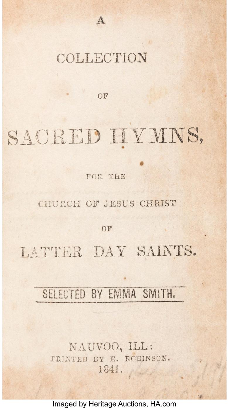 The rare first edition of the Nauvoo hymnal, Emma Smith's A Collection of Sacred Hymns, for the Church of Jesus Christ of Latter Day Saints (1841), sold for $100,000 at Heritage Auctions on March 4.