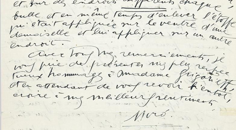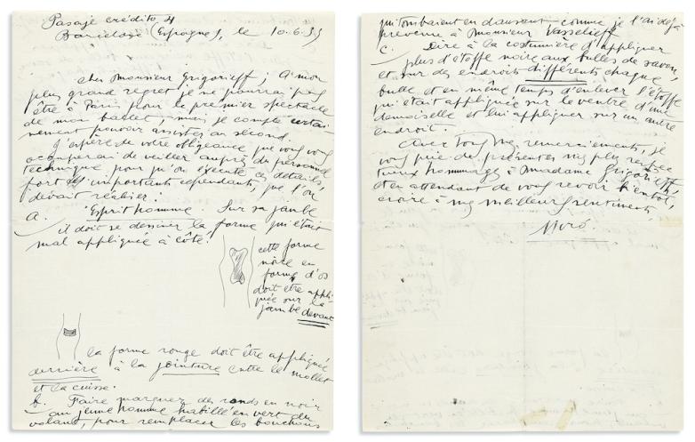 Detail from Joan Miró, Autograph Letter Signed, to Ballets Russes director Serge Grigoriev, with two small ink drawings, 1933. Estimate: $3,000-4,000