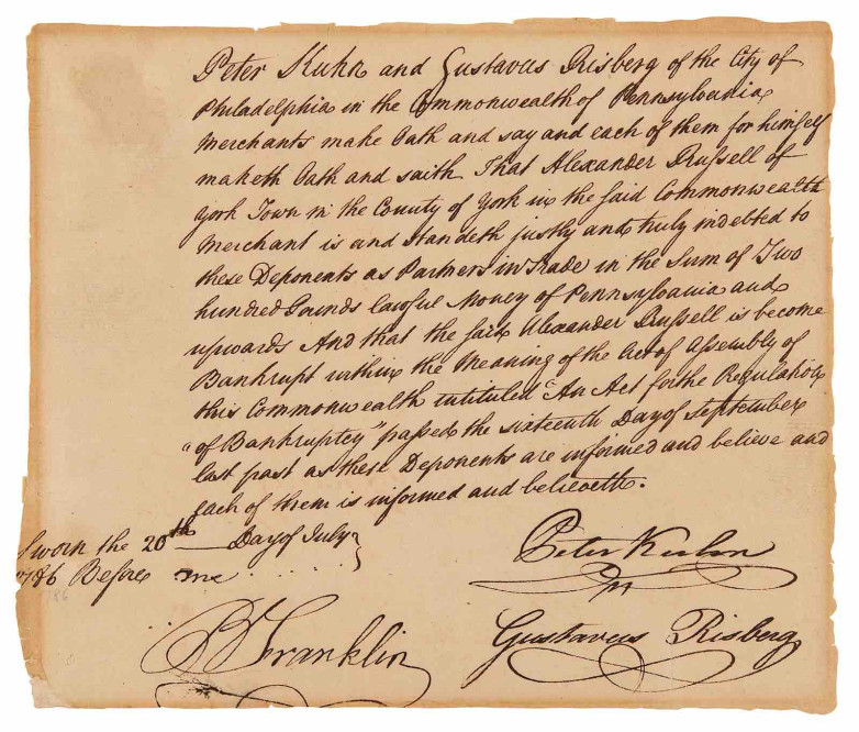- a 1786 document signed by Benjamin Franklin, then President of Pennsylvania, overseeing an early bankruptcy case between Philadelphia merchants (estimate: $15,000)