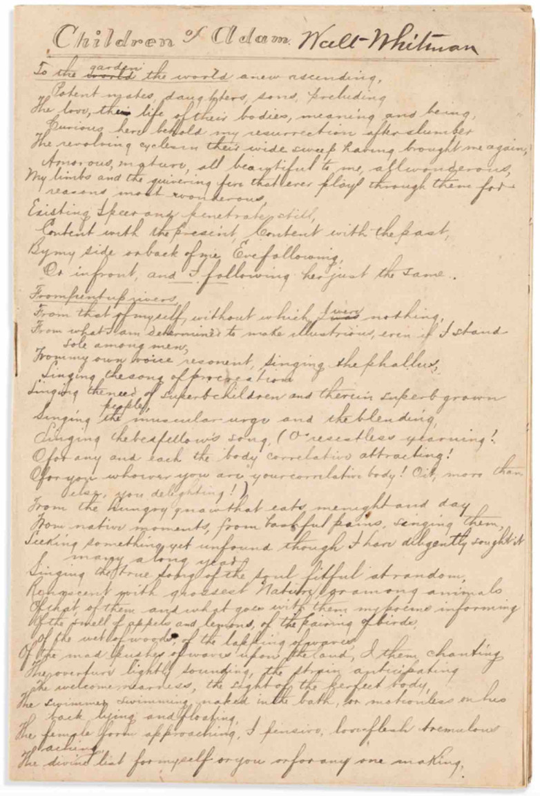 Also going under the hammer will be the signed manuscript draft of three comple poems from Walt Whitman's Leaves of Grass, To the Garden the World, From Pent-Up Aching Rivers, A Woman Waits for Me, and the first seven lines of I Sing the Body Electric (estimate: $7,000 - $10,000).