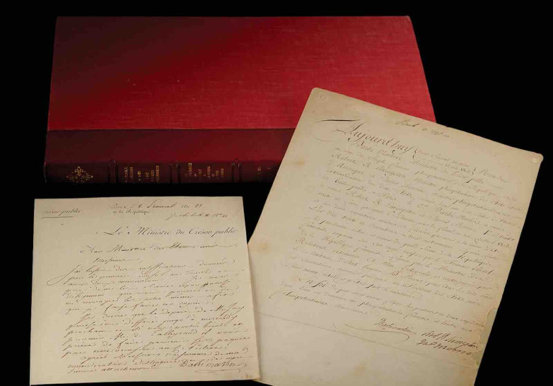 Additionally, there is a monumental manuscript documenting the delivery of France’s ratification of the Louisiana Purchase treaty. Signed in Paris on May 23, 1803 by James Monroe, Robert R. Livingston, and French minister François Barbé-Marbois, the document records receipt of the fully executed treaty - approved by Napoleon Bonaparte - and orders that it be sent to the President of the United States “without delay.”