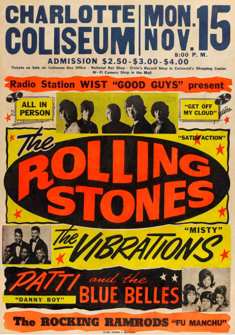 * a Jumbo Globe cardboard window card for The Rolling Stones, The Vibrations and Patti and the Blue Belles performing at the Coliseum in Charlotte, North Carolina, 1965.