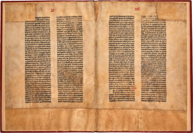 Bifolium from the Gutenberg Bible, formerly used as binder's waste, offered at Sotheby's this week.
