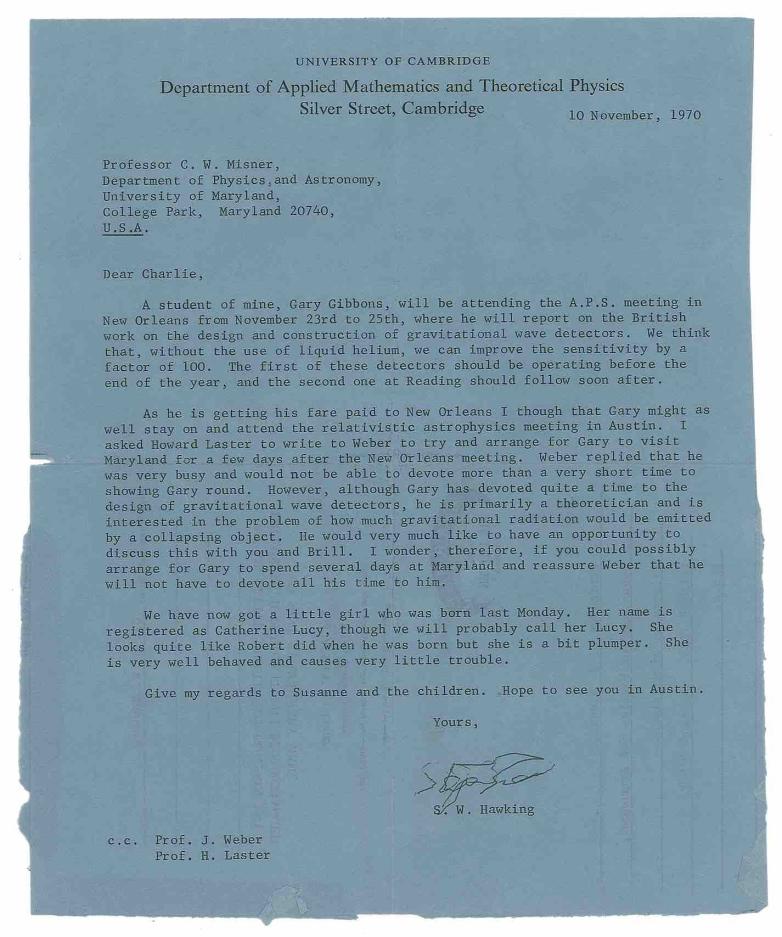 The exceedingly rare one page typed letter signed “Stephen,” on University of Cambridge, Department of Applied Mathematics and Theoretical Physics letterhead, dated November 10, 1970. Letter to physicist Charles W. Misner, a professor at the University of Maryland, in full: "A student of mine, Gary Gibbons, will be attending the A.P.S. meeting in New Orleans from November 23rd to 25th, where he will report on the British work on the design and construction of gravitational wave detectors. We think that, without the use of liquid helium, we can improve the sensitivity by a factor of 100. The first of these detectors should be operating before the end of the year, and the second one at Reading should follow soon after.