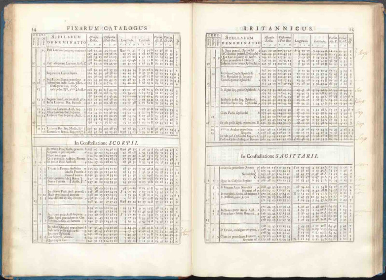 Pages 14 and 15 of Historia Coelestis, with marginal corrections and annotations by Crothswait