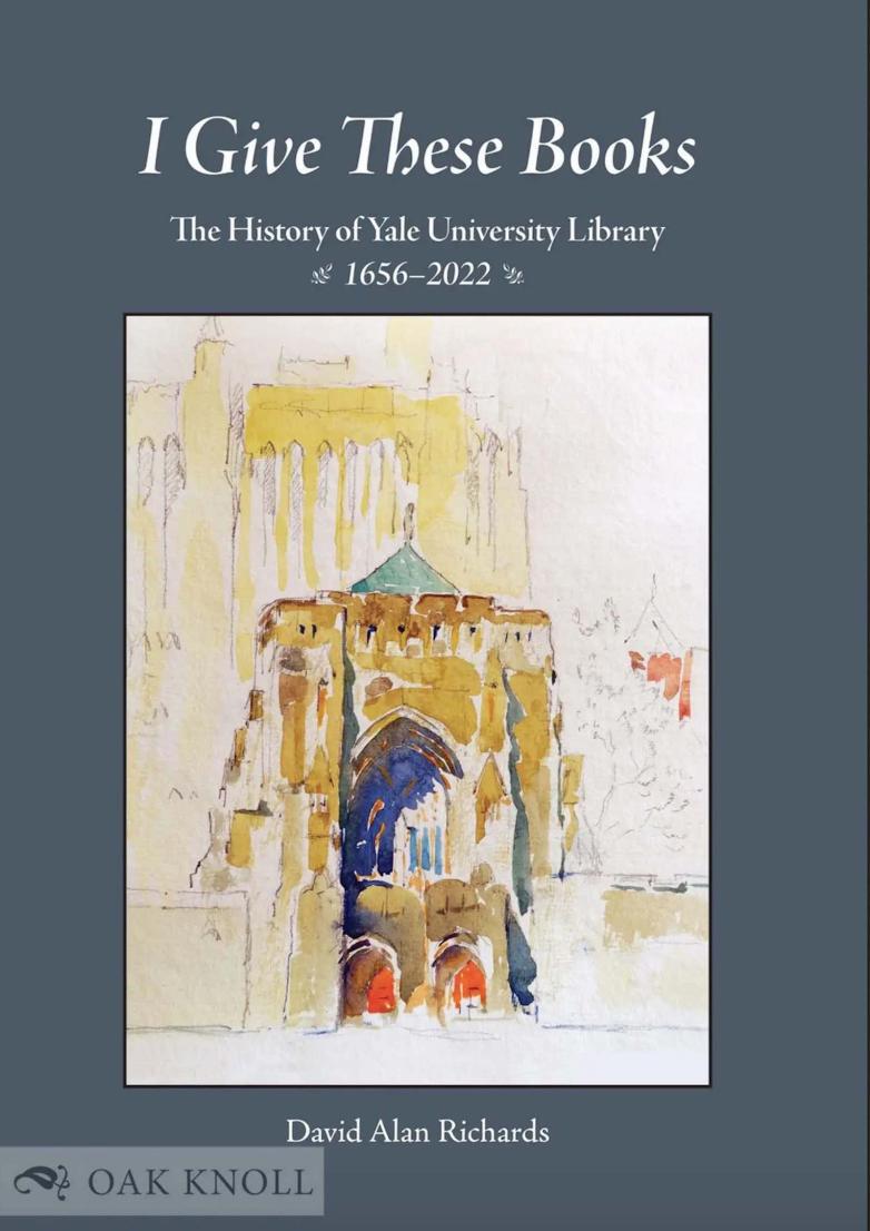 The founding, organization, and expansion of a major American university library over more than three centuries is the focus of I Give These Books: The History of Yale University Library 1656 - 2022 by David Alan Richards, published by Oak Knoll Press.