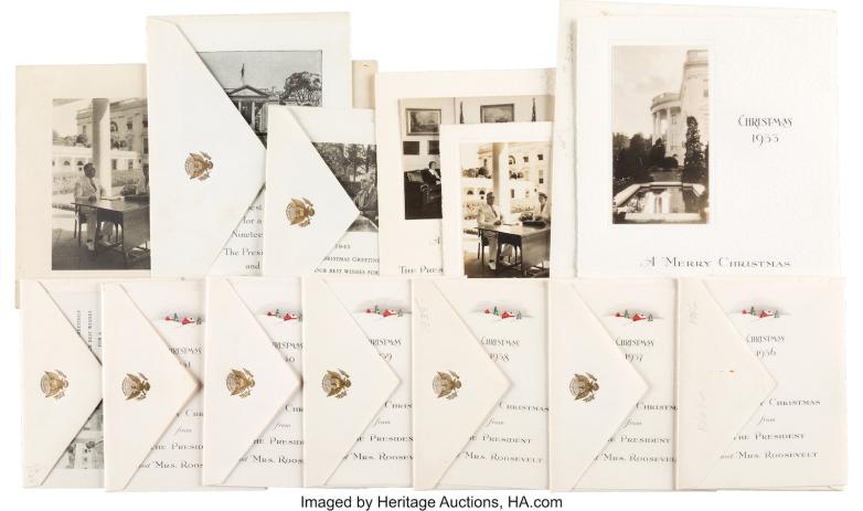 * Harry S. Truman: V-E Day Proclamation Signed as President and Inscribed to White House Chief of Staff John Steelman on Christmas Day: To commemorate the end of the war in Europe, this multicolored lithograph printed May 8, 1945, proclaims "Sunday, May 13, 1945, to be a day of prayer." With a lengthy inscription and large signature in the lower left margin, the president, whose birthday was May 8, has written, "This was a happy birthday for me. I hope this will be a happy Christmas for you. To Hon. John R. Steelman and Mrs. Steelman. 12/25/45." Steelman served as the first assistant to the president of the United States (a position today known as the White House chief of staff) from 1946 through 1953. Franklin D. Roosevelt: 13 White House Christmas Cards: This collection of 13 White House Christmas cards, many in their original transmittal envelopes, hail from 1933 to 1945. As Mary notes, even though there had been presidential Christmas greetings in the past, including these cards from Roosevelt's administration, the sending of a White House Christmas card only became an official tradition during the Eisenhower administration. "[The tradition] was never interrupted when there was a world war, when there was an assassination of a president or 9/11 or anything," she says. "It was always there and on time."