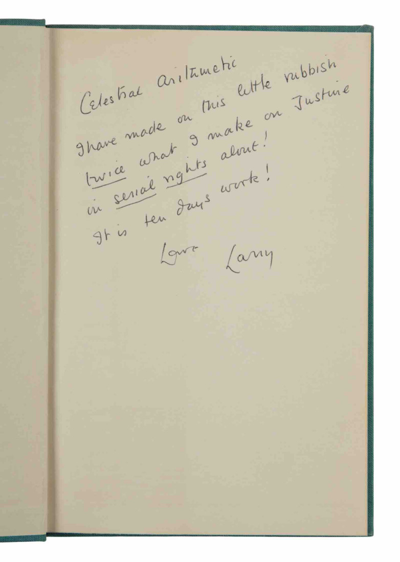 - Esprit de Corps (London, Faber and Faber, 1957), inscribed by Durrell to Miller: "Celestial arithmetic, I have made on this little rubbish twice what I make on Justine in serial rights alone! It is ten days work! Love, Larry." Also with Miller's signed bookplate.