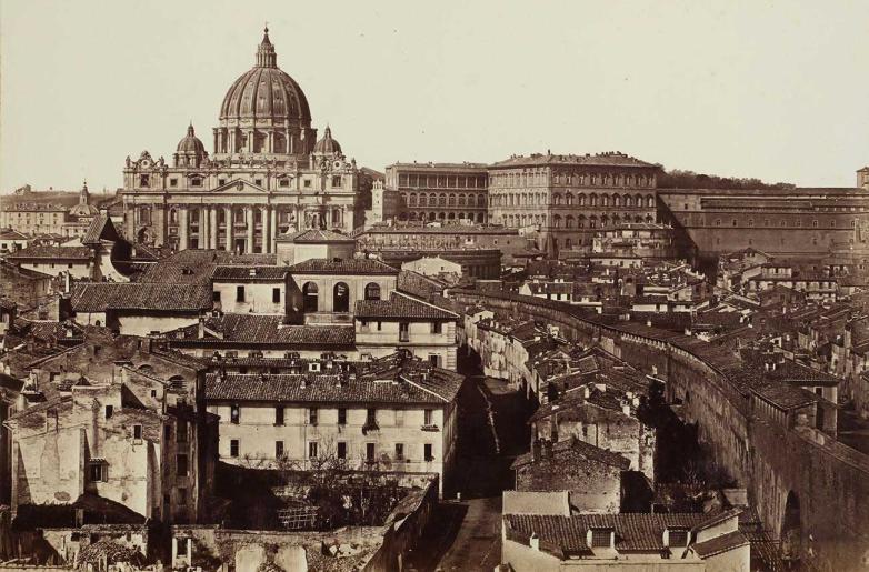 The Basilica of St. Peter’s and the Spina di Borgo Seen from Castel St. Angelo, ca. 1855, salt print, by James Anderson.