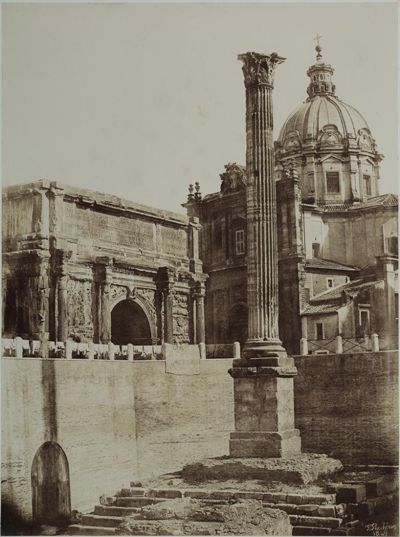 The Forum with the Column of Phocas, the Arch of Septimius Severus, and the Church of Santi Luca e Martina, 1849, salt print by Frédéric Flachéron.