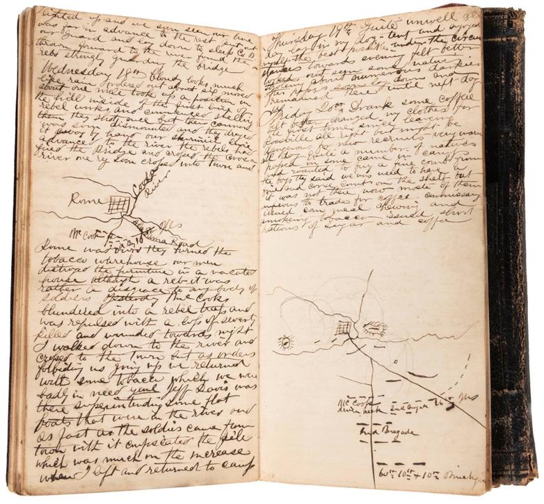• Lot #49, the diary of Captain Robert Pattison (1834–1917) of the 16th Illinois Infantry, is estimated at $1,000-1,500. This 112 page manuscript includes numerous hand drawn maps and pages with personal accounting and notations. Pattison was enrolled in the 16th Illinois Volunteers on May 24th, 1861 and honorably discharged on October 9th, 1864. He served as Lieutenant for most of his service until he was appointed Captain on May 18th, 1864.