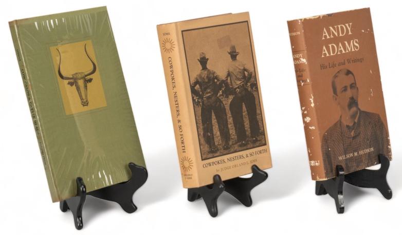 * Bill Wittliff's copies of three hardcover books: the 1964 first edition of Andy Adams: His Life and Writings by Wilson M. Hudson, published by Southern Methodist University Press (Dallas, Texas), with dust jacket; the 1970 first edition of Cowpokes, Nesters & So Forth by Judge Orland L. Sims, published by The Encino Press: Austin (Texas), with dust jacket; the 1967 first edition of Cow Camps & Cattle Heards, by John A. Lomax, with illustrations by Bill Wittliff, published by The Encino Press: 1902 Arthur Lane (Austin, Texas), with dust jacket, signed by the author, copy 41 of 750 specially designed copies. (estimate $200- $400)