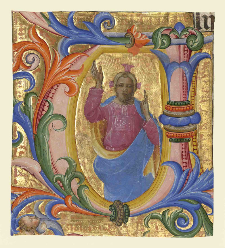 * Initial V: Christ Blessing, painted by Lorenzo Monaco, the most celebrated illuminator of early 15th century Florence. In the figure Christ is nestled within lush vegetation enwrapping the letter V, and the image is further enhanced by Monaco’s use of vivid colors and a rich golden background. This is the first work painted by Monaco to enter Getty’s collection