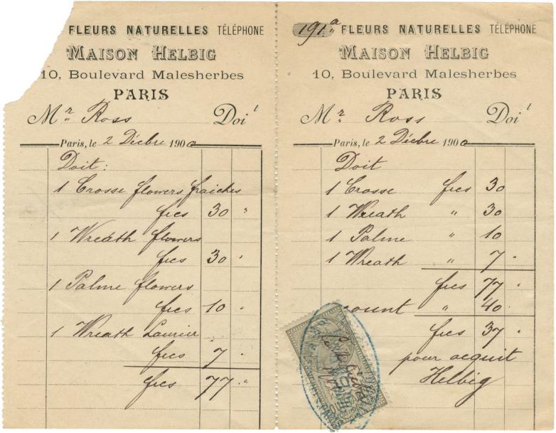 • The bill for flowers at Oscar Wilde’s funeral, made out to Robert Ross, amounting to 77 francs, submitted by Maison Helbig of 10 Boulevard Malesherbes, Paris, 2 December 1900.