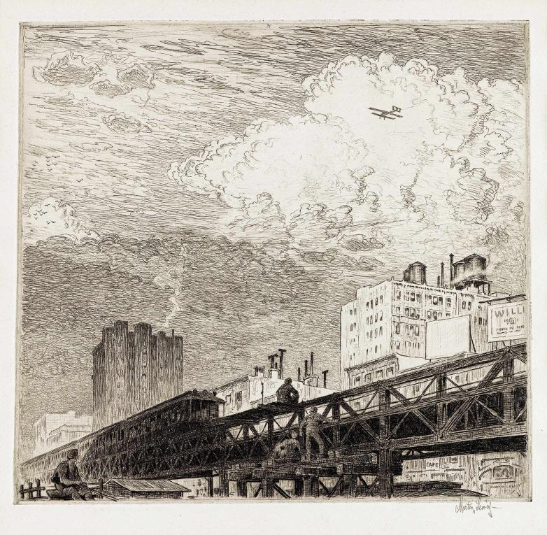 Martin Lewis, Men Working on Elevated Train Tracks, Looking at Airplane in Sky, etching, circa 1919. Sold for $42,500. An auction debut for the print.