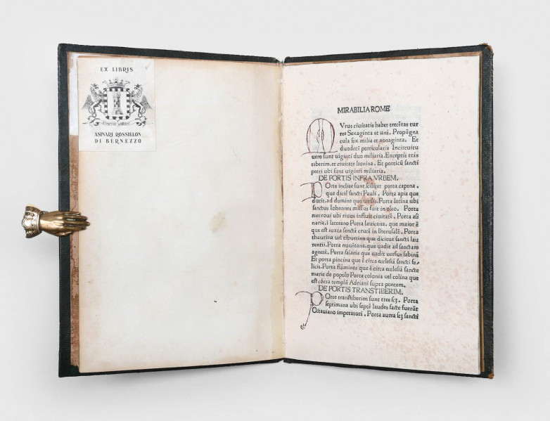 Mirabilia Romae (1475) is a rare incunable edition of the earliest European printed guidebook, a geographically arranged inventory of the musts-see sites of Rome. This copy was handsomely bound in green morocco for the library of Prince Ferdinando of Savoy, first duke of Genoa, with his coat of arms and initials in gilt on the covers. This is one of the earliest known editions.