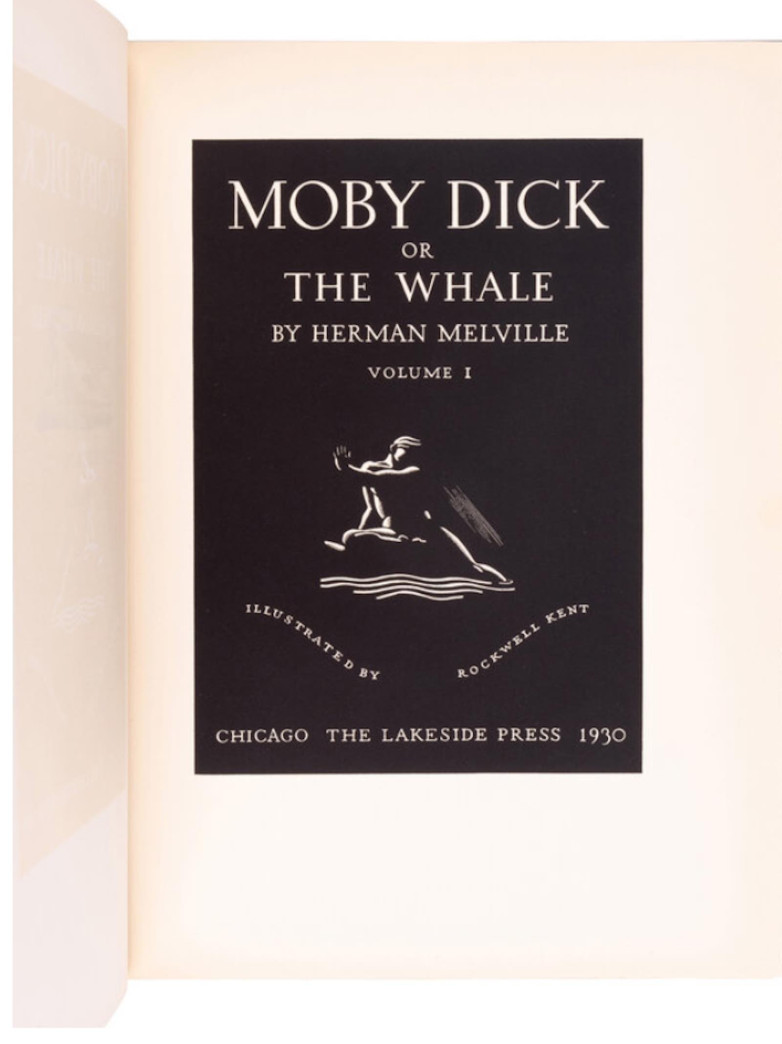 The Lakeside Press first trade edition of Herman Melville's Moby Dick, or The Whale (Chicago: The Lakeside Press, 1930. Vols. 1 and 2 (of 3) only, 4to) was printed on fine rag-paper, one of the four books produced by Lakeside for the 'Four American Books' series. Moby Dick - which features Kent's pen, brush, and ink drawings - was the only one to sell out completely, and put Chicago on the map as an important center of American book illustration.