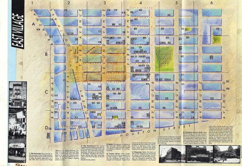 * Promotional materials created by the Eye, including maps and guides of the East Village and invitations and flyers for Eye-affiliated parties, openings, and events;