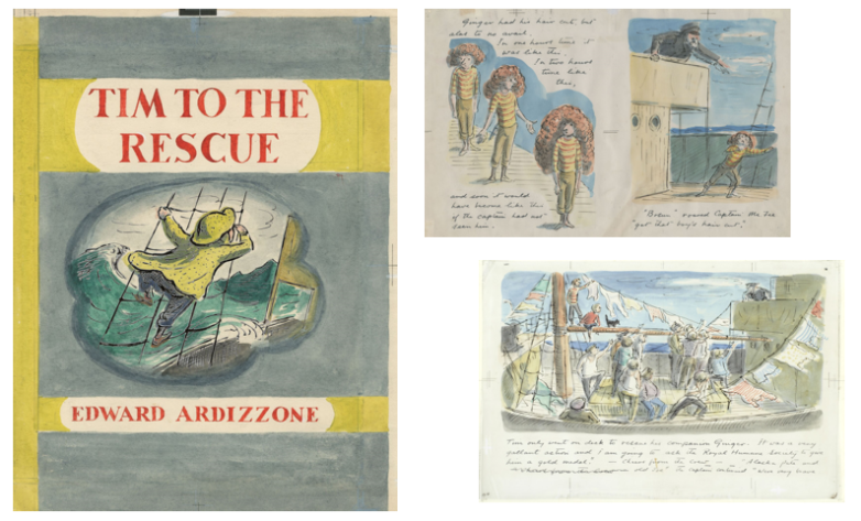 Published by Oxford University Press in 1949, Tim to the Rescue is the third in Ardizzone’s Little Tim series of picture books which began with the publication of Little Tim and the Brave Sea Captain in 1936. The adventures of Tim – all of which take place at sea – quickly gripped the imagination of children on both sides of the Atlantic. When Ardizzone returned from military service as an official war artist in World War II, he began work on a new tale, which, like its predecessors, he both wrote and illustrated. Tim to the Rescue introduces Ginger, a mischievous cabin boy whose life Tim saves during a storm and who reappears later in the series.