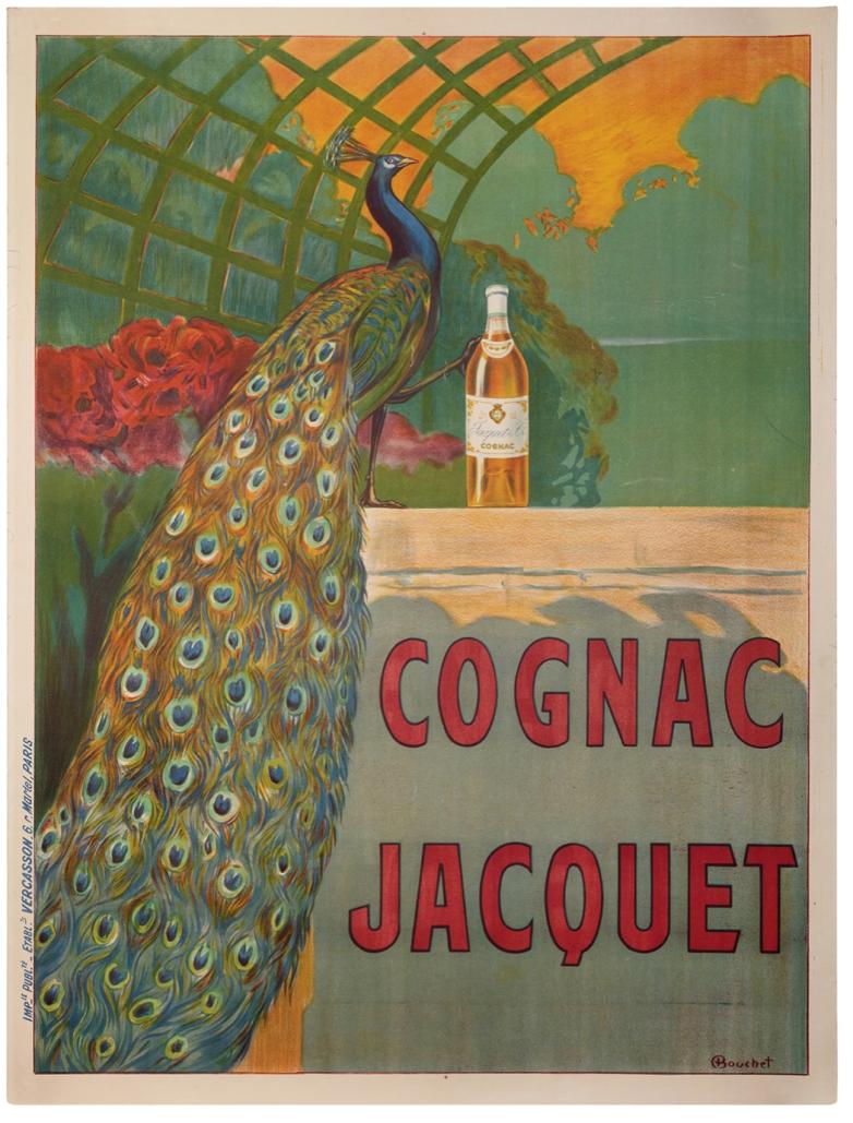 · Lot #561, Camille Bouchet's (1799–1890) Cognac Jacquet, is estimated at $900-1,300. This iconic, linen backed color lithograph poster depicts a colorful peacock and a bottle of cognac. It measures 62-½ x 46-¼” and was printed in the 1920s in Paris by Vercasson.