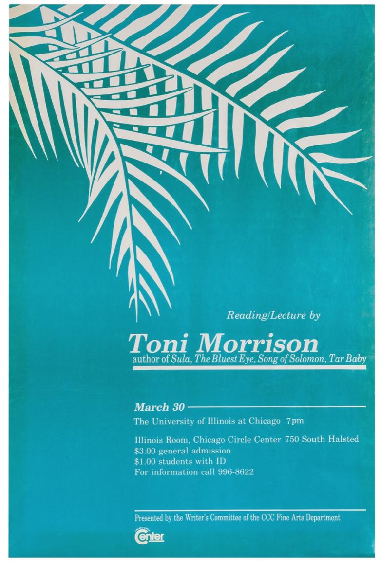 A c. 1980s turquoise and white Toni Morrison reading lecture poster is estimated at $200-300. The piece advertises her appearance at the University of Illinois at Chicago.