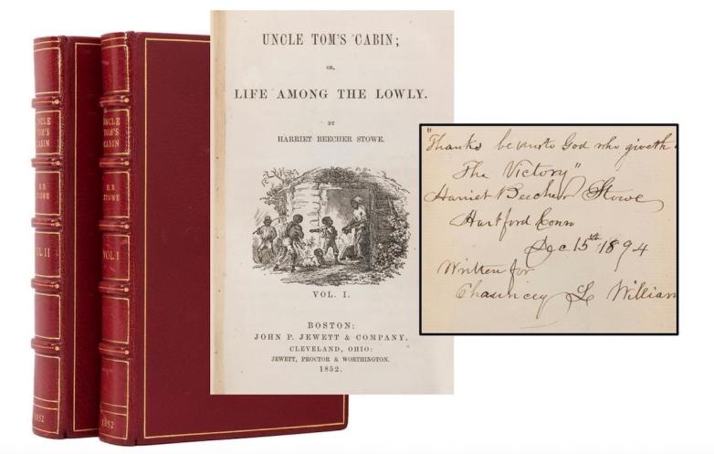 •    Lot #480, a first edition, first printing of Harriet Beecher Stowe's two volume Uncle Tom’s Cabin; or, Life among the Lowly, was estimated at $3,500-5,000 and scored $9,000. It was published in 1852 in Boston by John P. Jewett & Co. This treasure retained its cloth slipcase and came with an autographed note by Stowe.