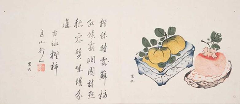 Persimmon and tangerines, with calligraphy in running cursive script by Xing Yi, Fruit 9, Ten Bamboo Studio Manual of Calligraphy and Painting, Ming dynasty, Chongzhen period to early Qing dynasty, ca. 1633-1703.