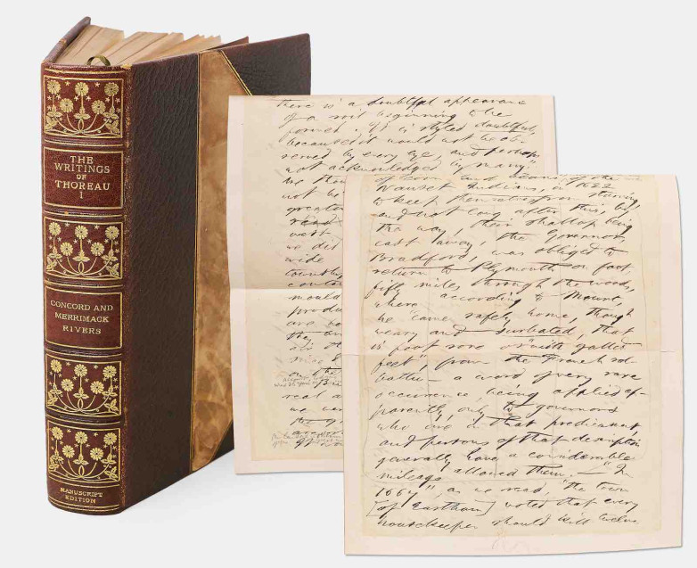 The manuscript leaf (10.25'' x 8.5'' unfolded) is inlaid and tipped into Volume 1 which bears the publisher's signature on the limitation page. The 10 volumes present (Volumes 1 and 6-13 of Thoreau's journal, plus Volume 5, Excursions and Poems) are bound in the publisher's three-quarter levant morocco leather with gilt floral tooling and feature photogravure plates by Herbert W. Gleason and color frontispieces. Bidding begins at $5,000.