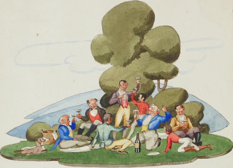 Unpublished watercolor illustration of a picnic featuring Mr. Pickwick, Sam Weller, Mr. Tupman, Mr. Winkle, Mr. Weller, a gamekeeper, and his two sons by Italian artist Anna Marongiu, ca. 1928-29.