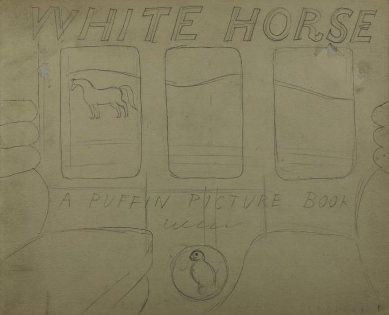 This dummy (pictured at left) was believed to have been lost for many years after Ravilious’ death in 1939 while working as a war artist, but turned up at auction in 2012 after an artist friend of Carrington’s realized the publisher had given it to him in the 1950s and he simply had it at home. It includes pencil drawings of chalk hill figures and other earthworks as well as several photographs, possible layouts, and a potential cover. Wiltshire Museum bought it for £4,800.