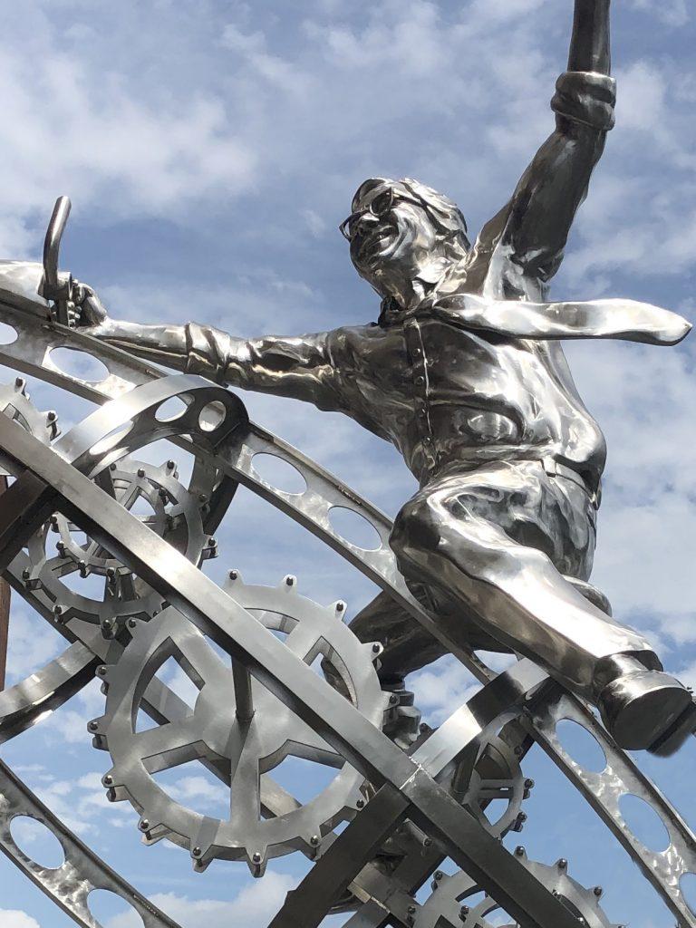 The Waukegan Public Library in Waukegan, Illinois, unveiled a 12-foot statue of Ray Bradbury last Thursday, August 22, on what would have been the late author’s 99th birthday. The stainless steel sculpture, titled “Fantastical Traveler,” is much like the man himself: brilliant and bursting with creative energy. It features Bradbury riding a rocket ship while holding onto a book and was inspired, said its creator, Zachary Oxman, by Bradbury’s poem, “If Only We Had Taller Been.”
