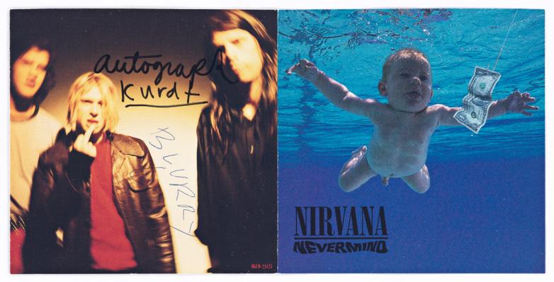 Nirvana’s Nevermind compact disc insert signed and inscribed days after release by Kurt Cobain,
