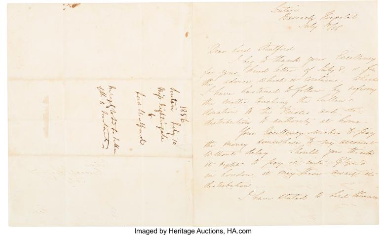 In the letter (estimate: $2,000+) addressed to Lord Stratford de Redcliffe, Nightingale expresses her gratitude for his advice in a recent letter to her, and promising to help distribute a large donation Sultan Abdulmecid of the Ottoman Empire made to the nurses and hospitals in response to efforts by Nightingale and other British nurses to improve conditions in hospitals during the Crimean War.